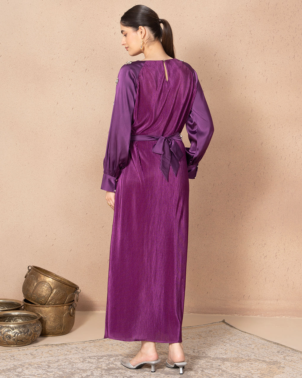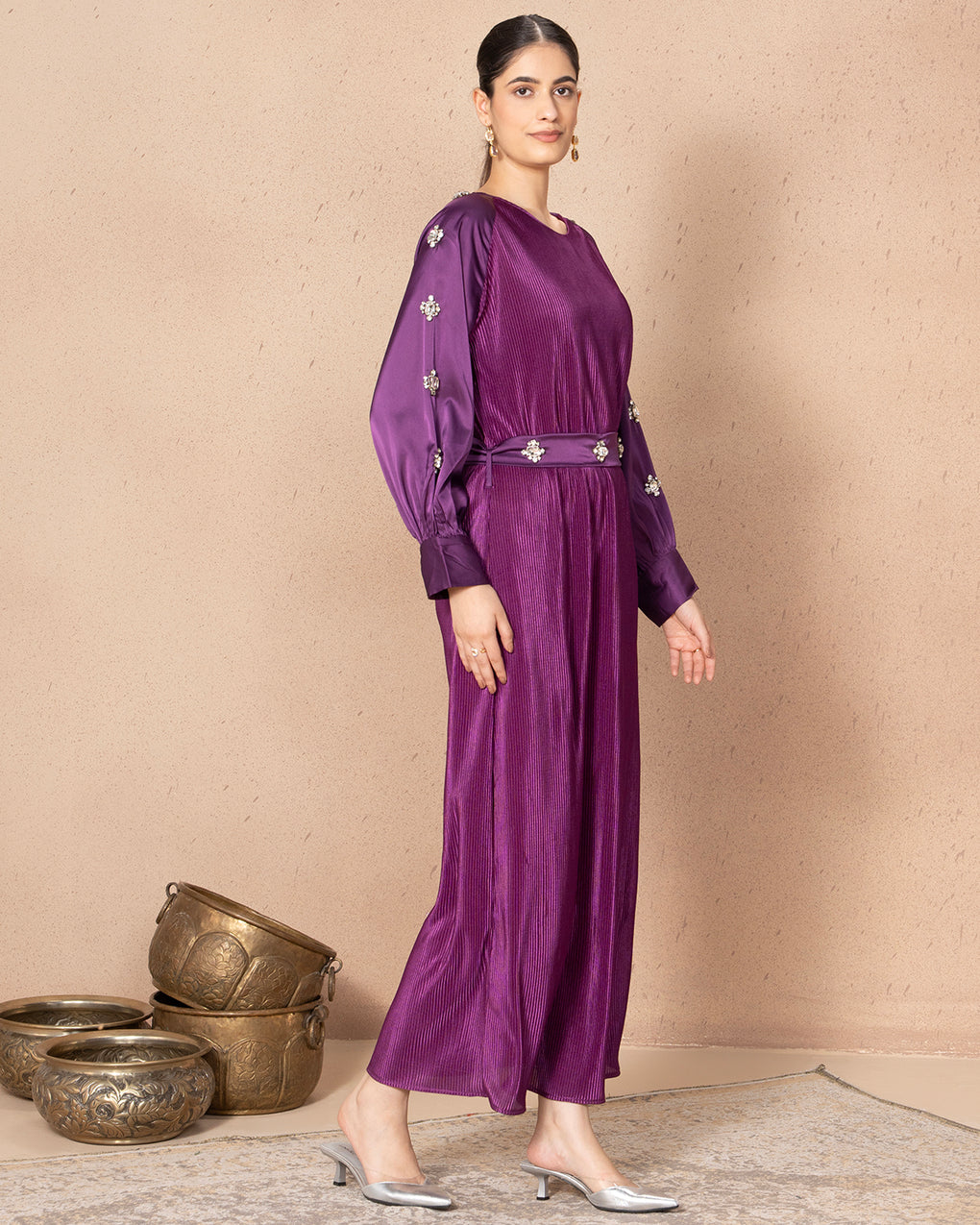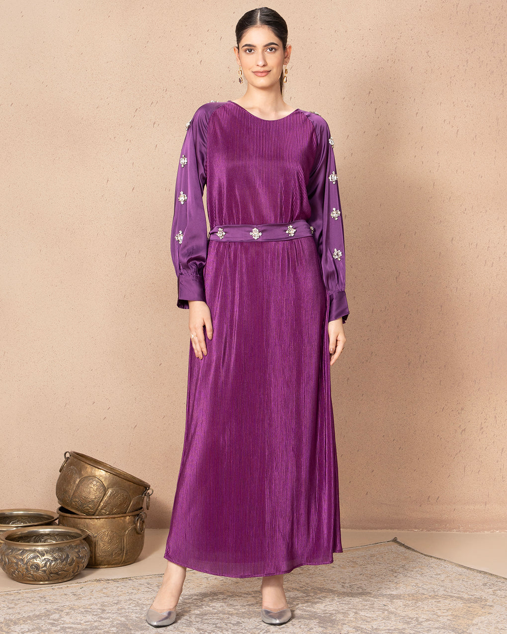 This elegant, pleated satin long dress comes in either a vibrant purple, featuring modest long sleeves with cuffed ends. A beautiful matching belt, accented with prominent, sparkling stones, defines the waistline, adding a touch of glamour to the flowing silhouette.