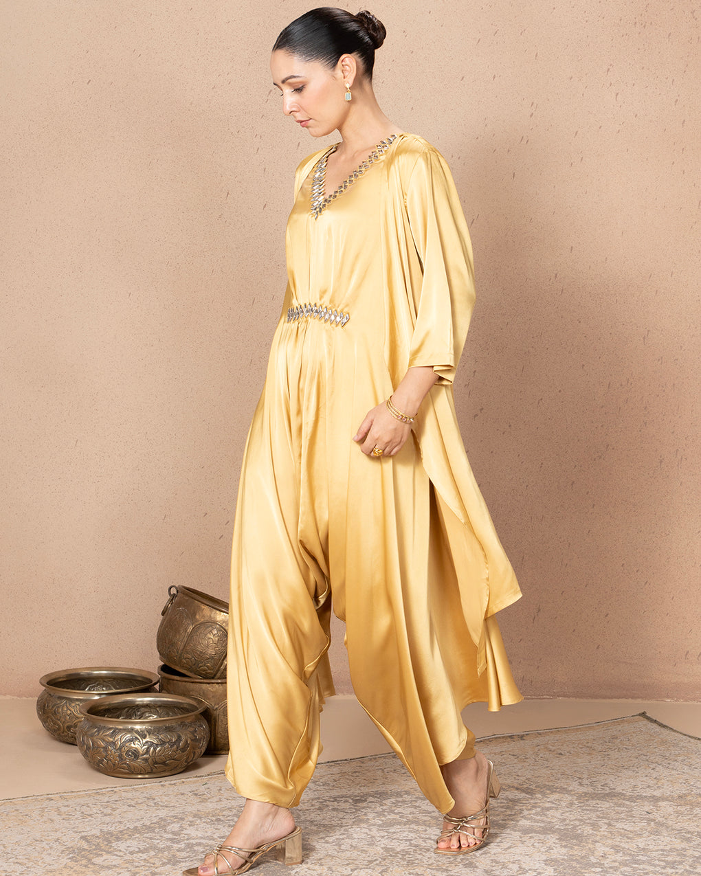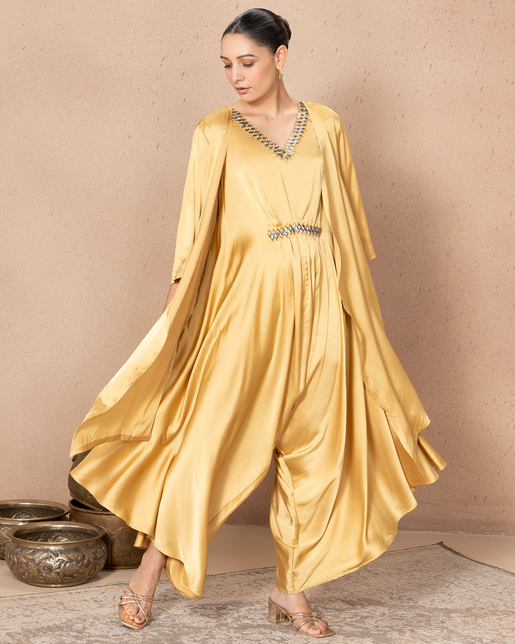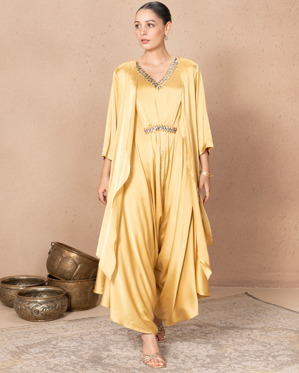 Flowy draped jumpsuit with subtle bead accents, perfect for effortless elegance.