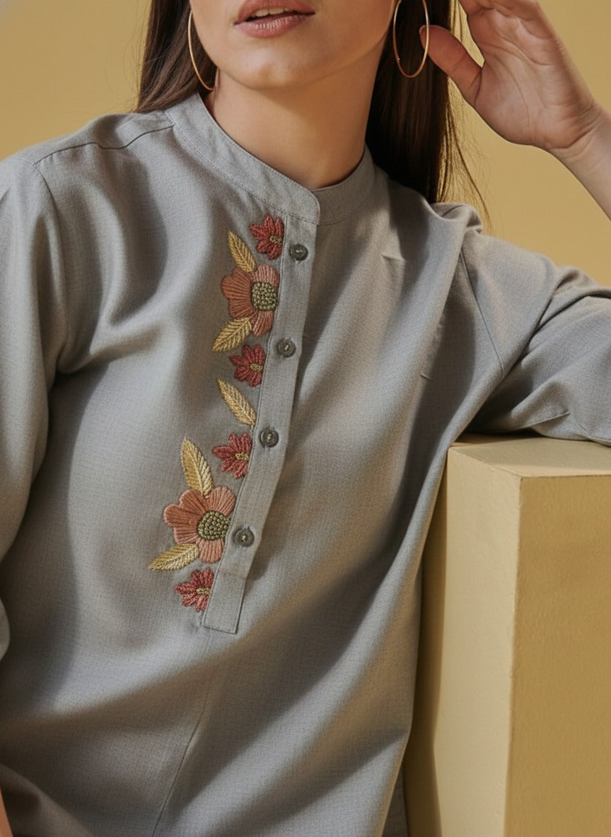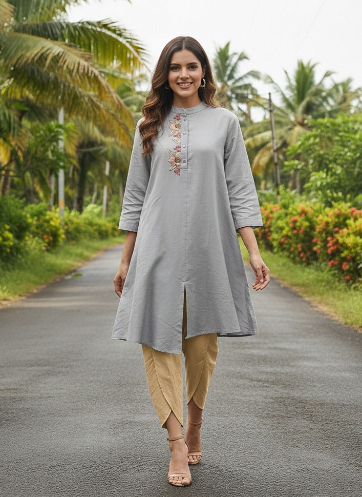 This elegant tunic with an uneven hemline with a subtle thread embroidery with a dash of gold will be your favourite outfit soon. Pair it up with straight silk pants or tulip pants to complete the look.
