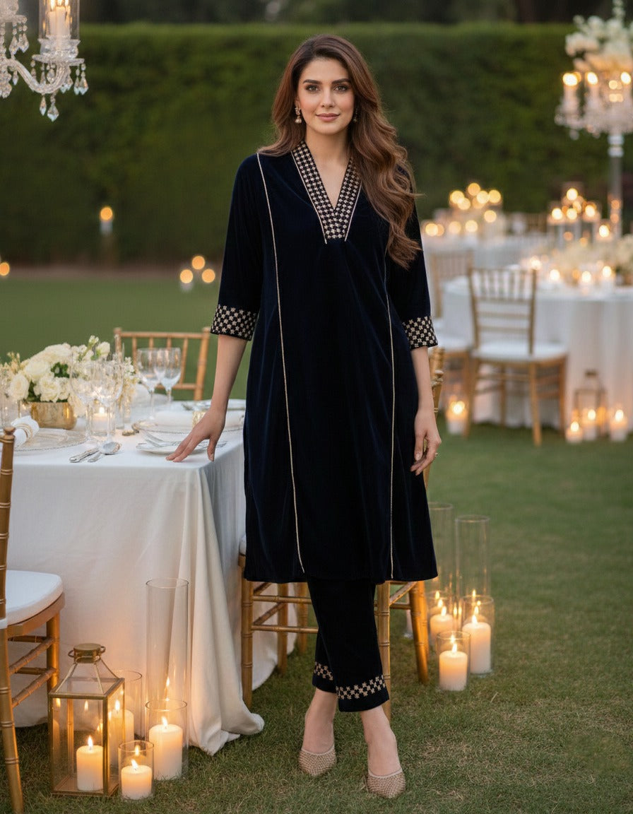 Elegant velvet kurta with contrast checkered accents and subtle piping detail.