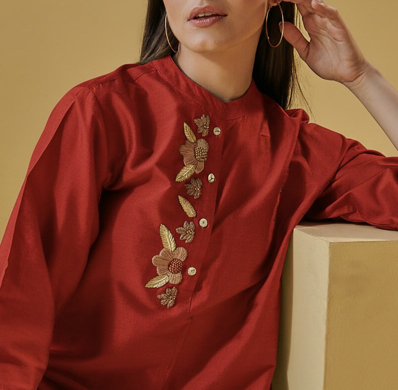 This elegant tunic with an uneven hemline with a subtle thread embroidery with a dash of gold will be your favourite outfit soon. Pair it up with straight silk pants or tulip pants to complete the look.