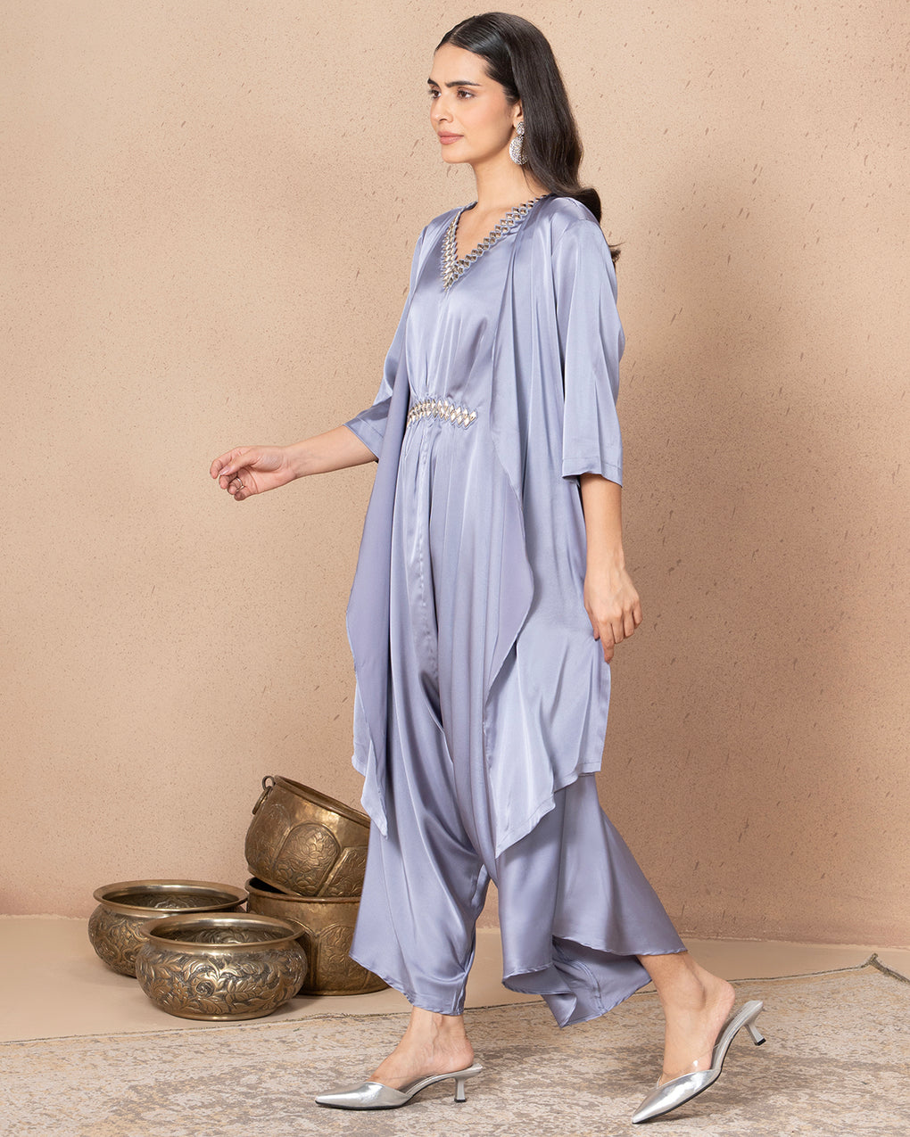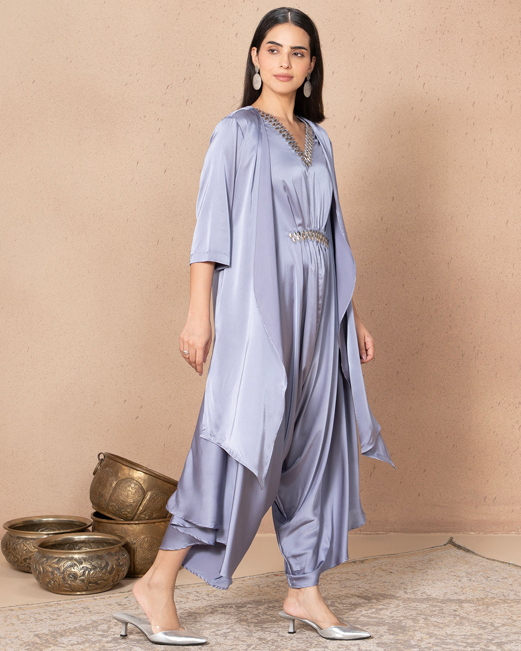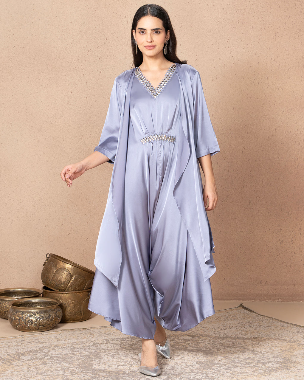Flowy draped jumpsuit with subtle bead accents, perfect for effortless elegance.