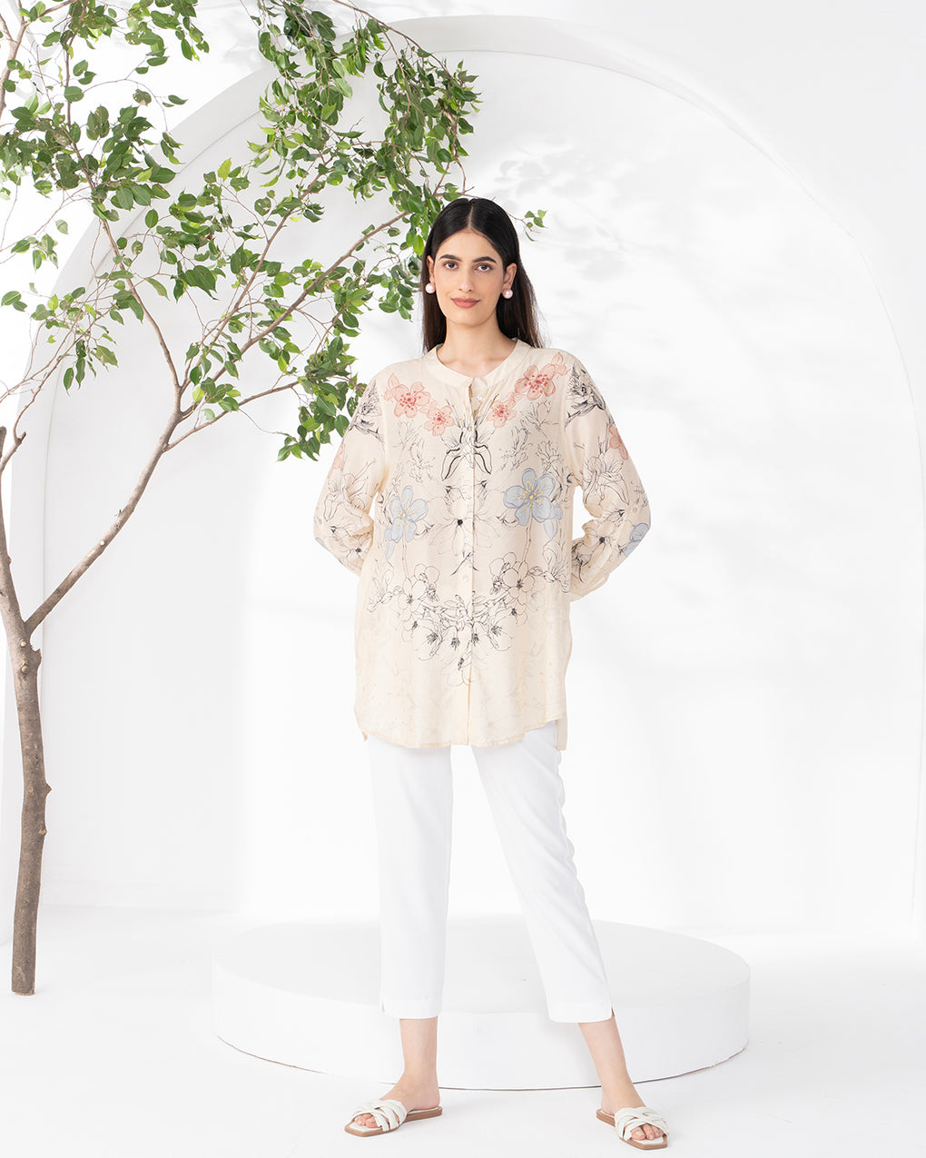 This shirt blends artistic floral prints with subtle embroidered detailing, creating a balanced look of softness and sophistication. Designed in pastel hues with a comfortable fit, it’s ideal for workdays, casual outings, or elevated everyday wear.