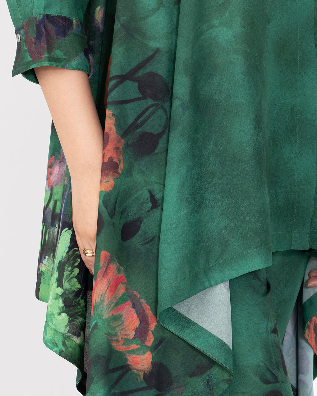Green-toned Bodhi Belle shirt crafted in luxurious Habutai silk, featuring a fluid drape and an elegant, flowing silhouette. Accented with subtle artistic prints and a refined finish, it offers timeless sophistication with effortless movement.