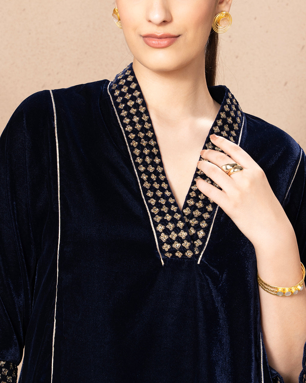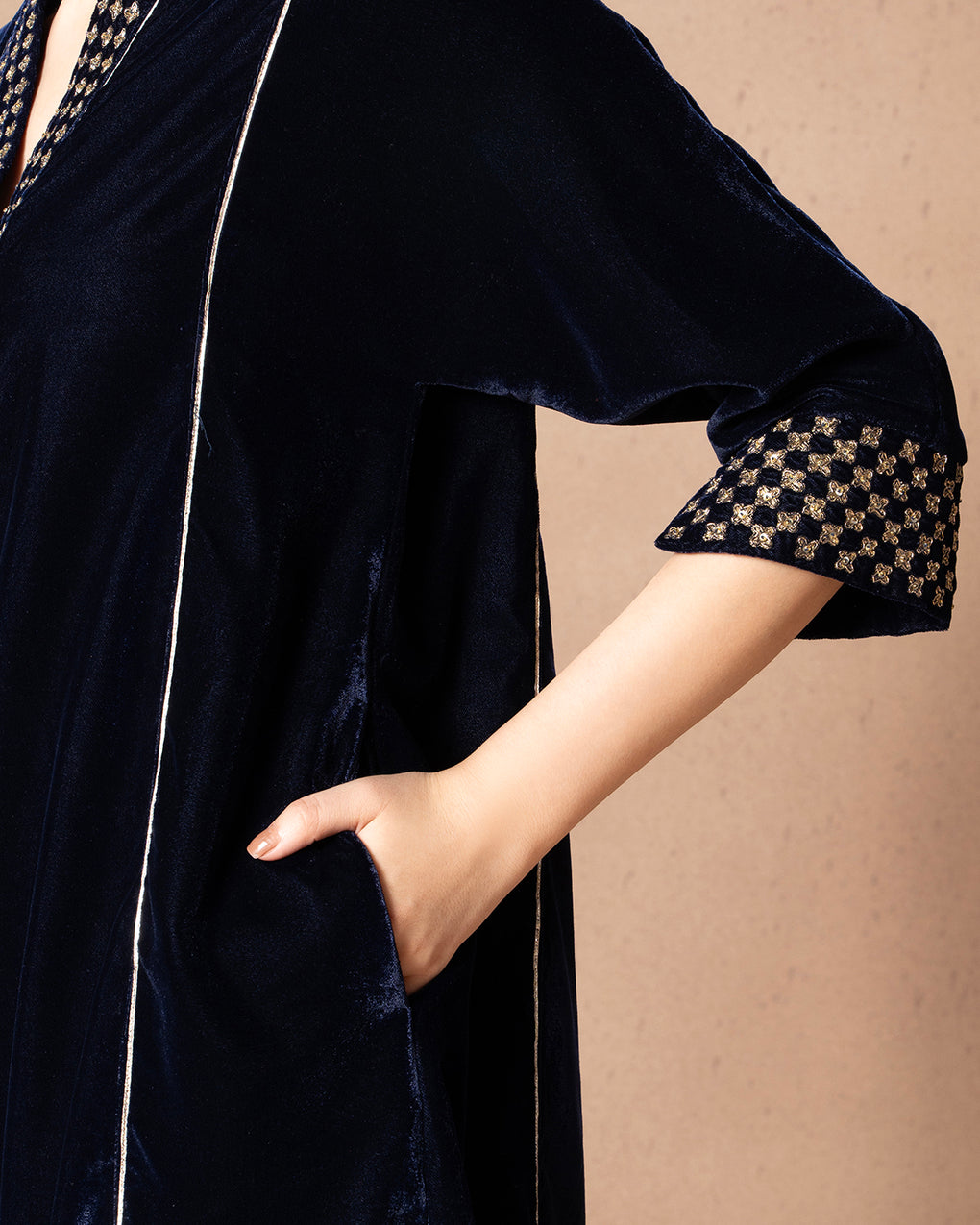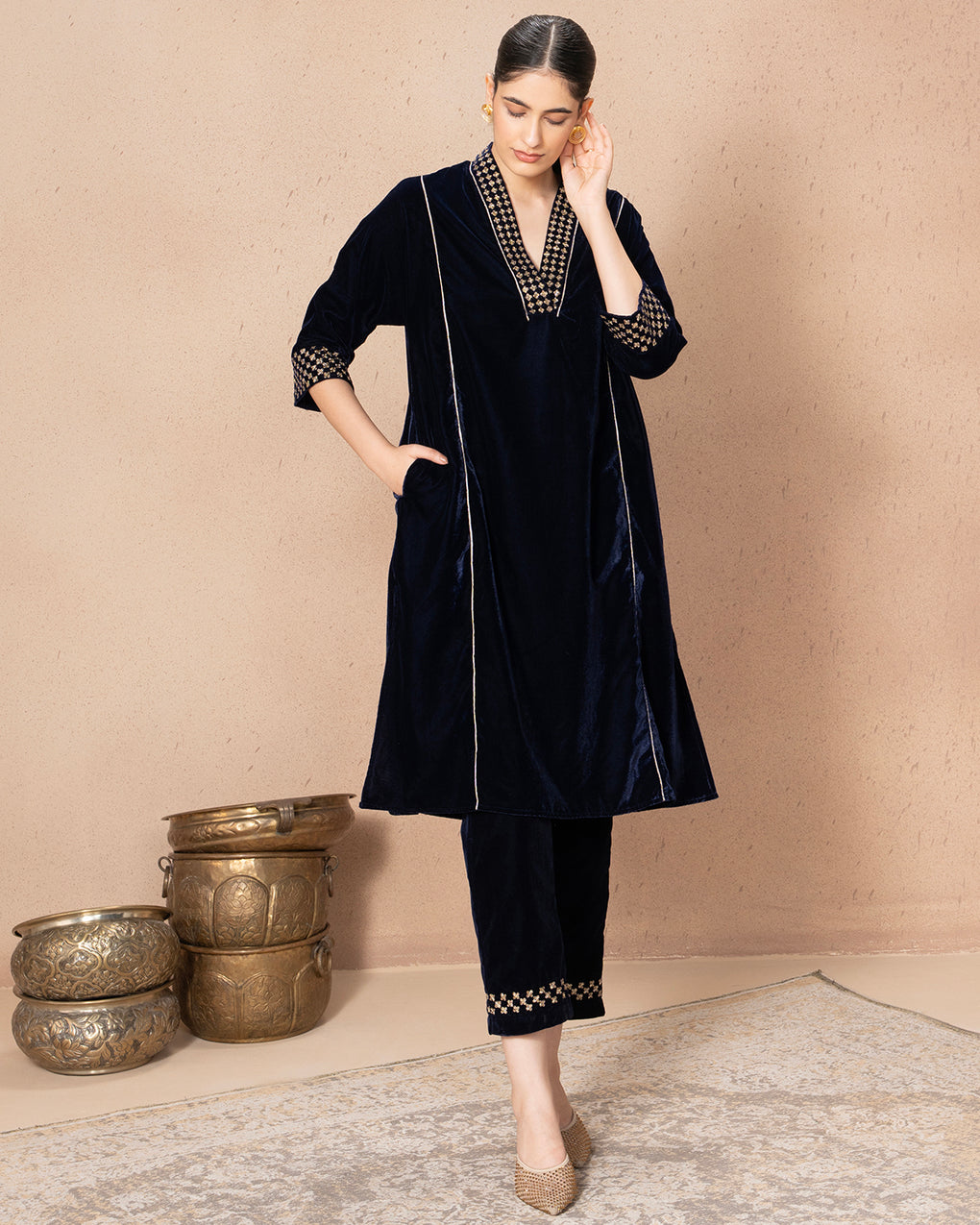 Elegant velvet kurta with contrast checkered accents and subtle piping detail.