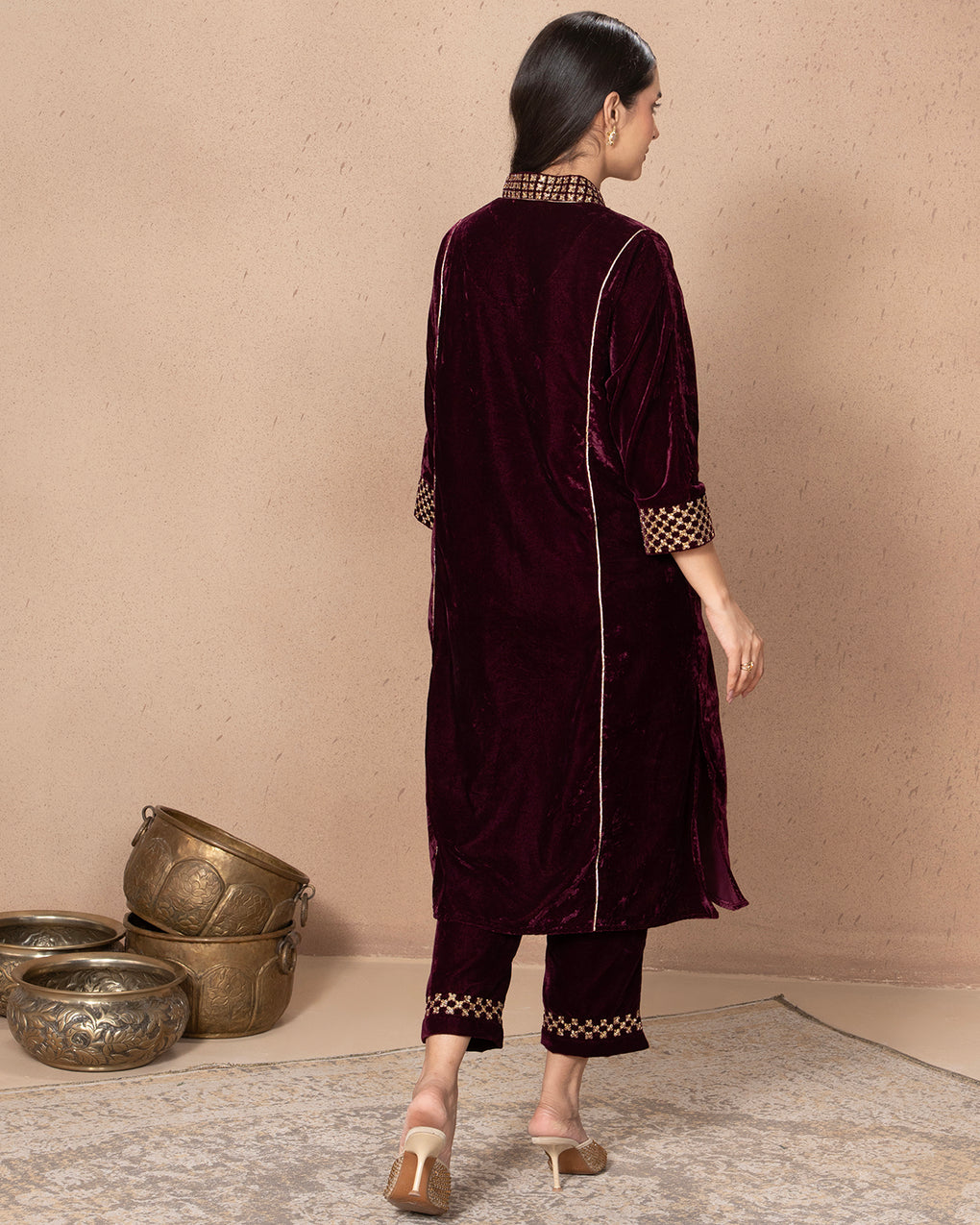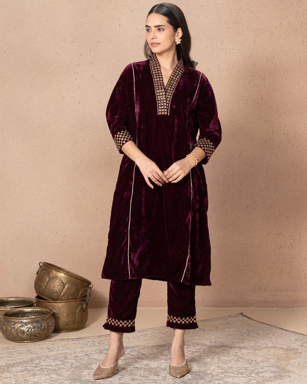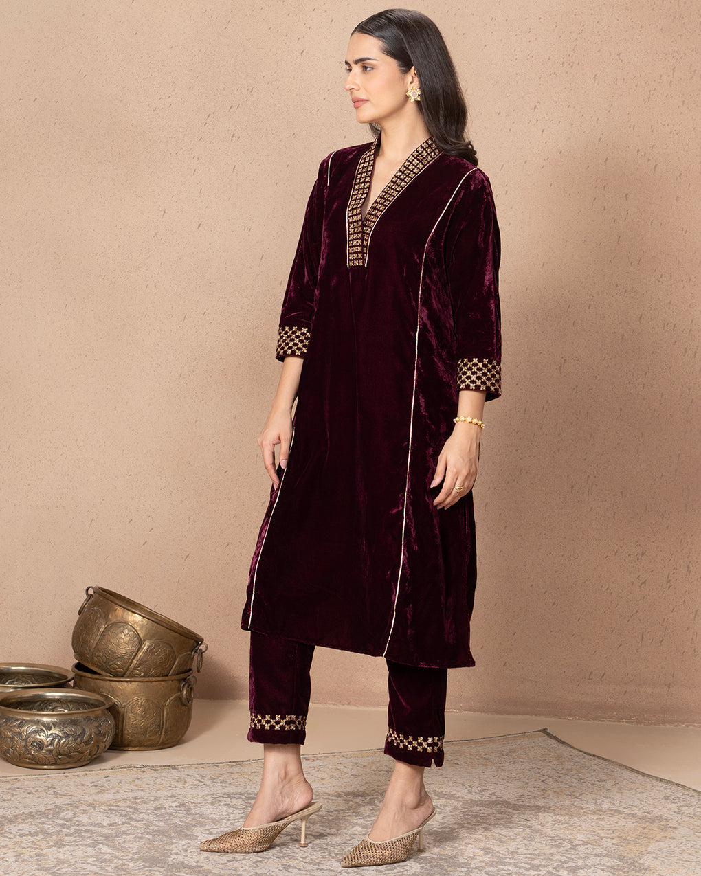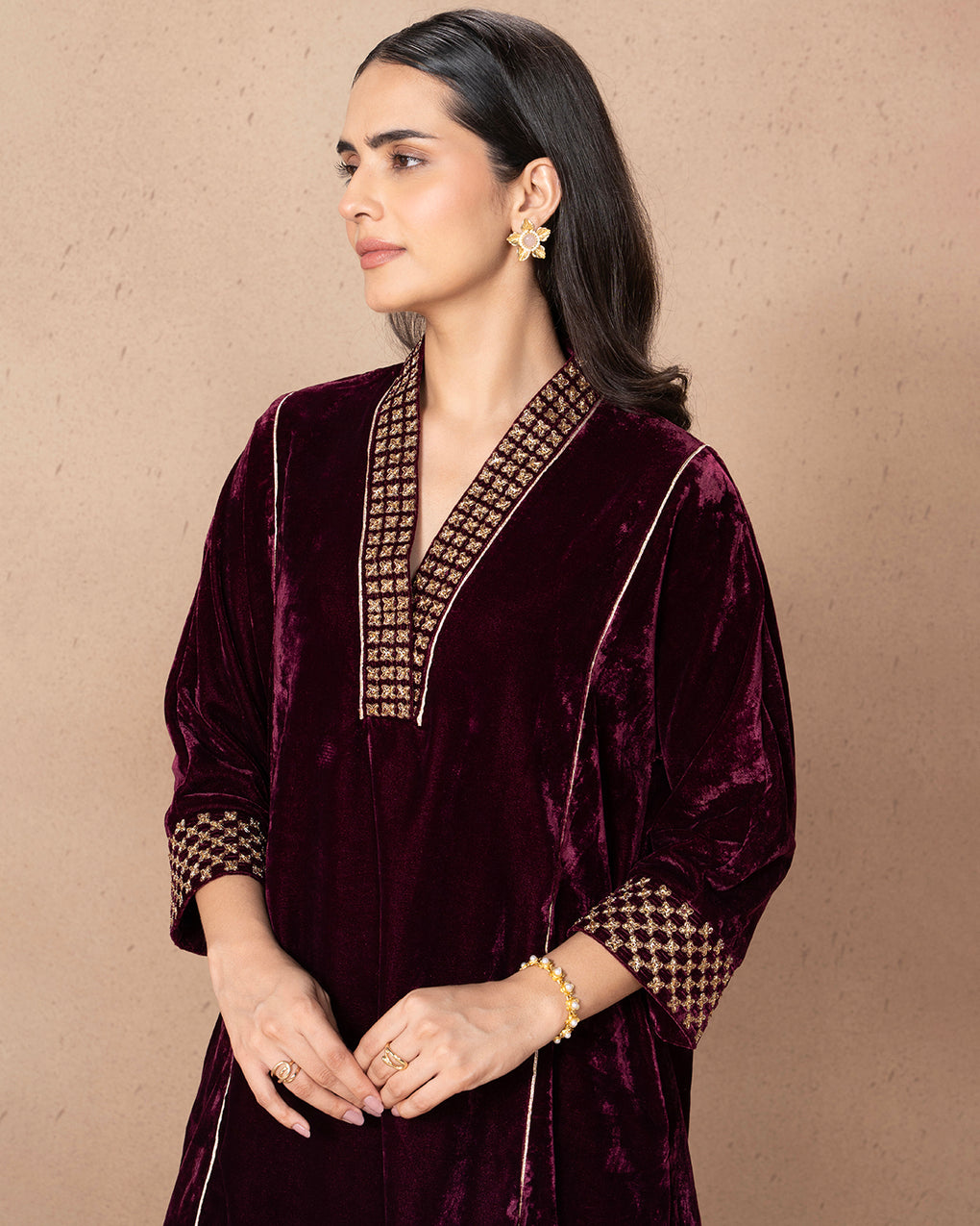 Elegant velvet kurta with contrast checkered accents and subtle piping detail.