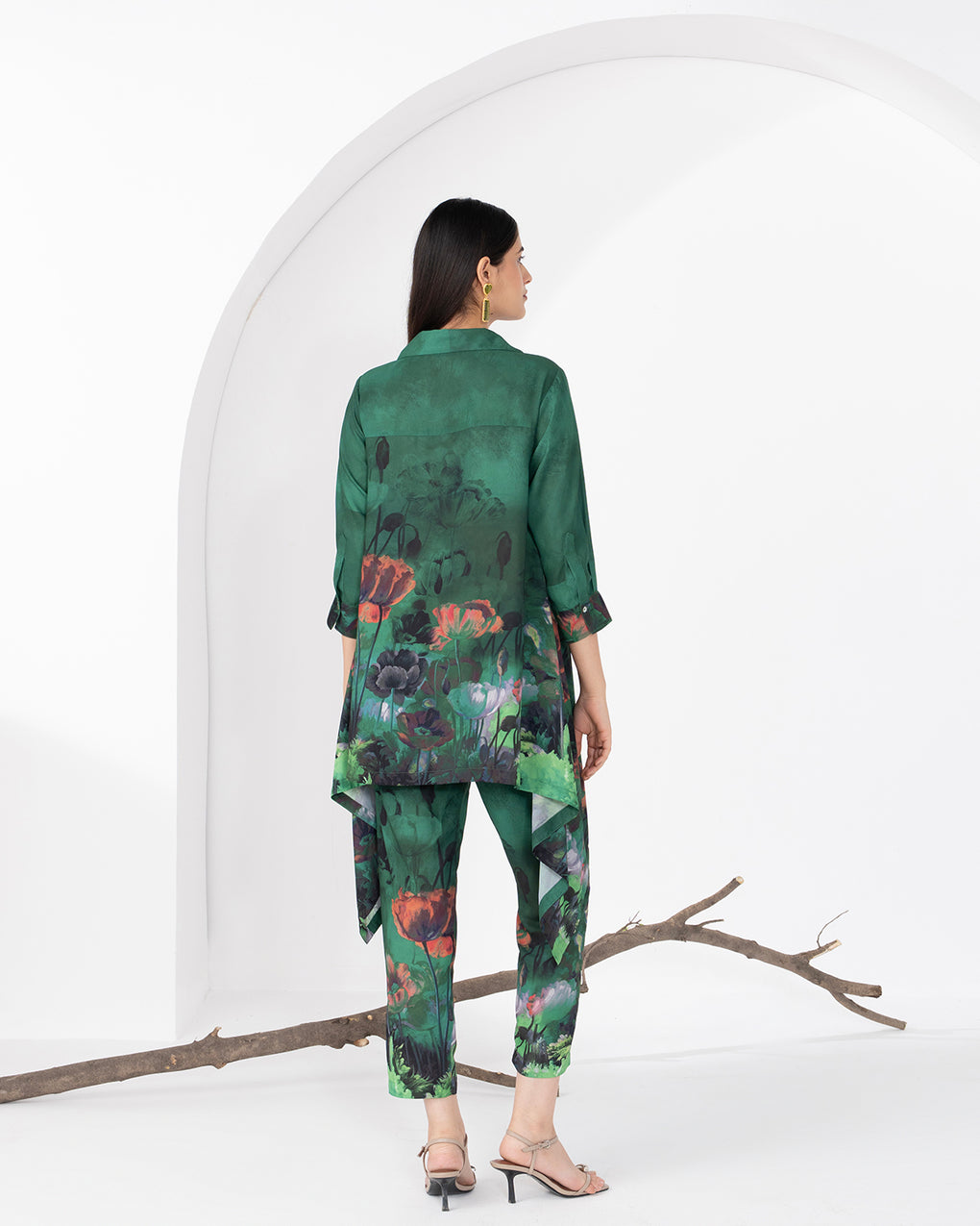 Flowy straight-fit trousers crafted in a rich green hue with an artistic floral print for effortless elegance. Designed with a relaxed silhouette and breathable fabric, perfect for all-day comfort and chic styling.
