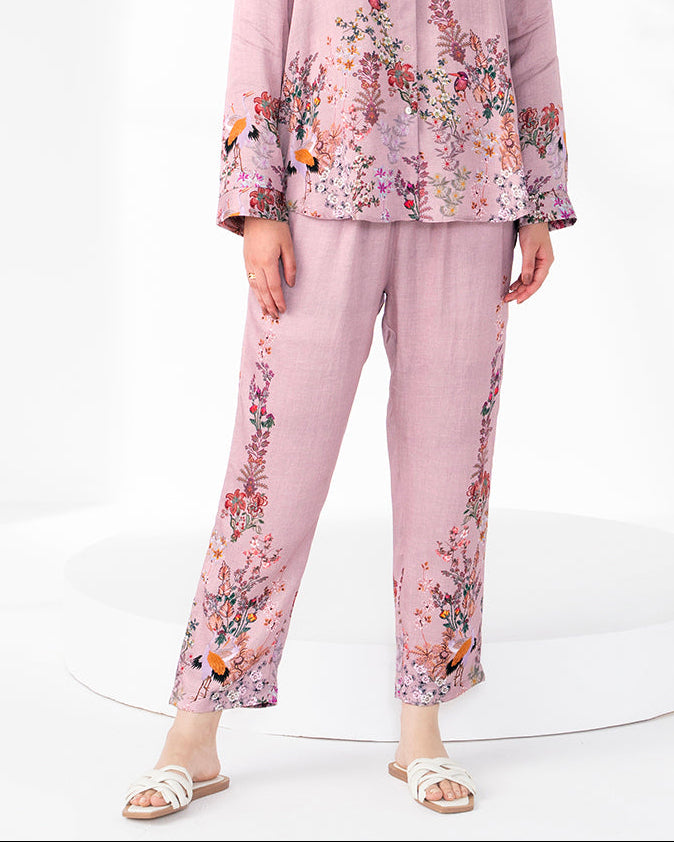 Elegant satin linen trousers in a calming aqua tone, featuring delicate floral and bird-inspired prints for a refined, nature-inspired look. Lightweight and breathable with a relaxed silhouette, they offer effortless comfort and graceful movement.
