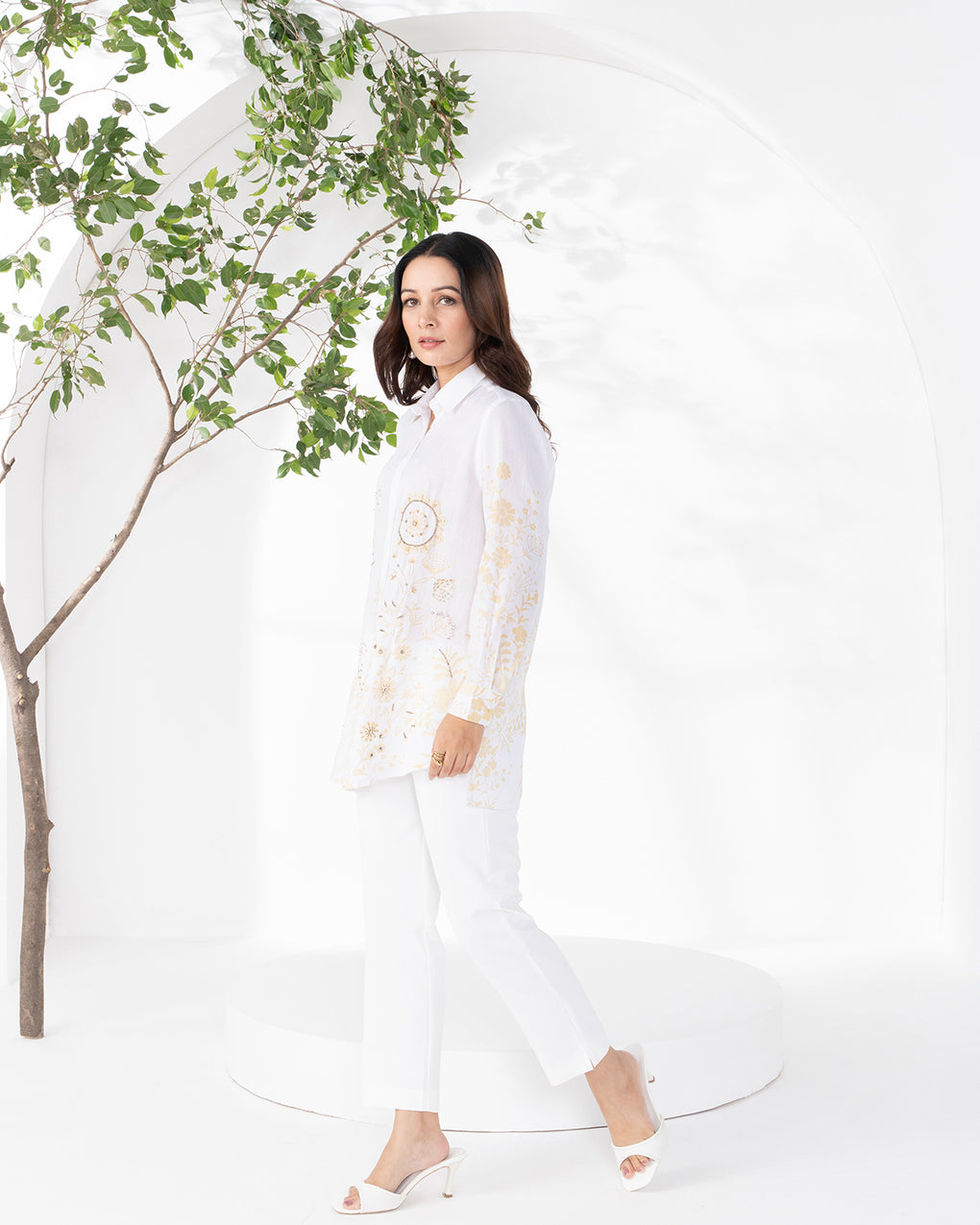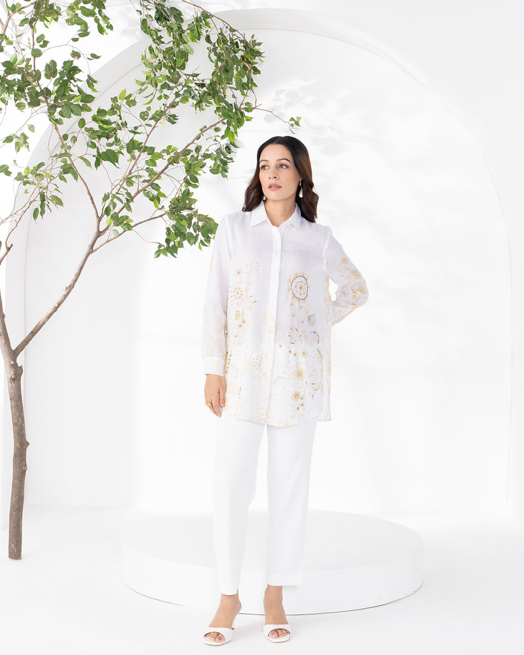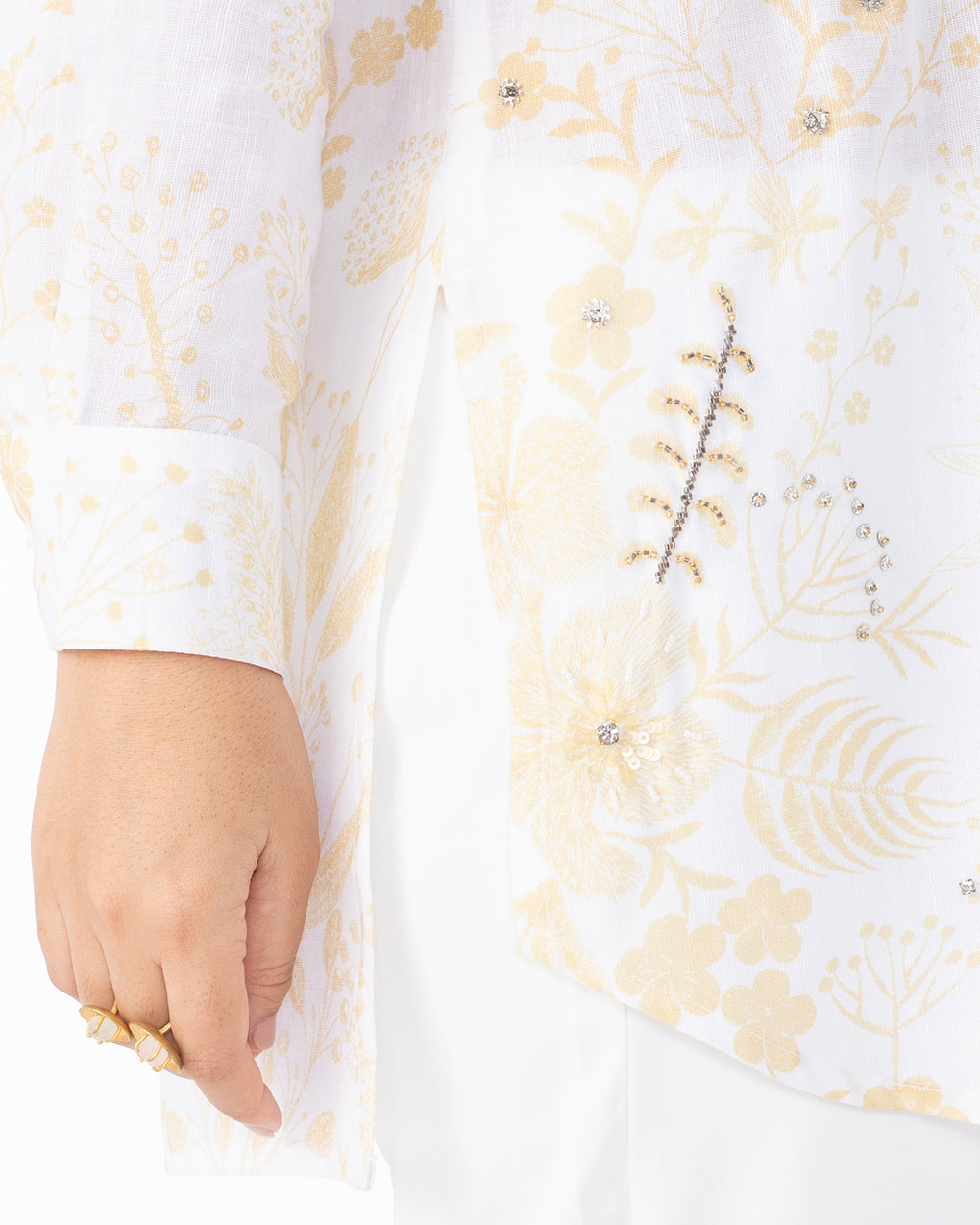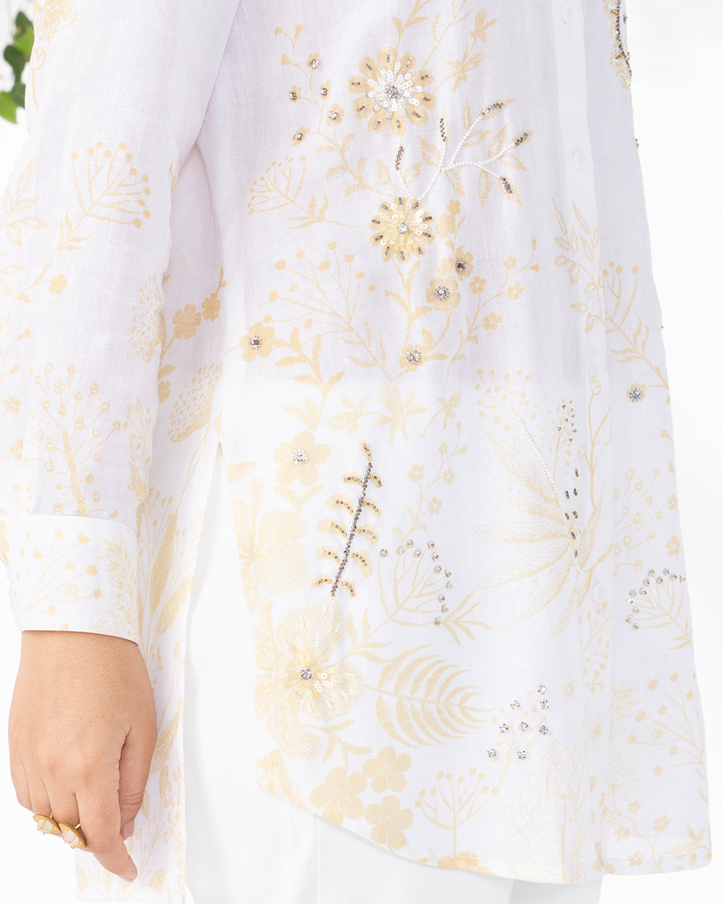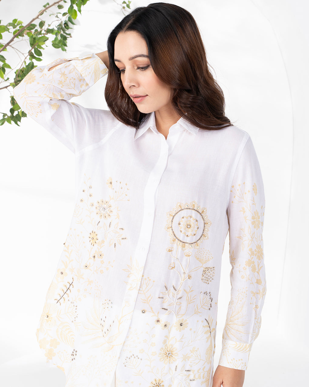 A lightweight linen shirt in soft, soothing hues, detailed with delicate floral print or embroidery and subtle embellishments. Designed with a relaxed silhouette and classic collar, it offers effortless comfort with a refined, feminine appeal perfect for everyday wear or resort styling.