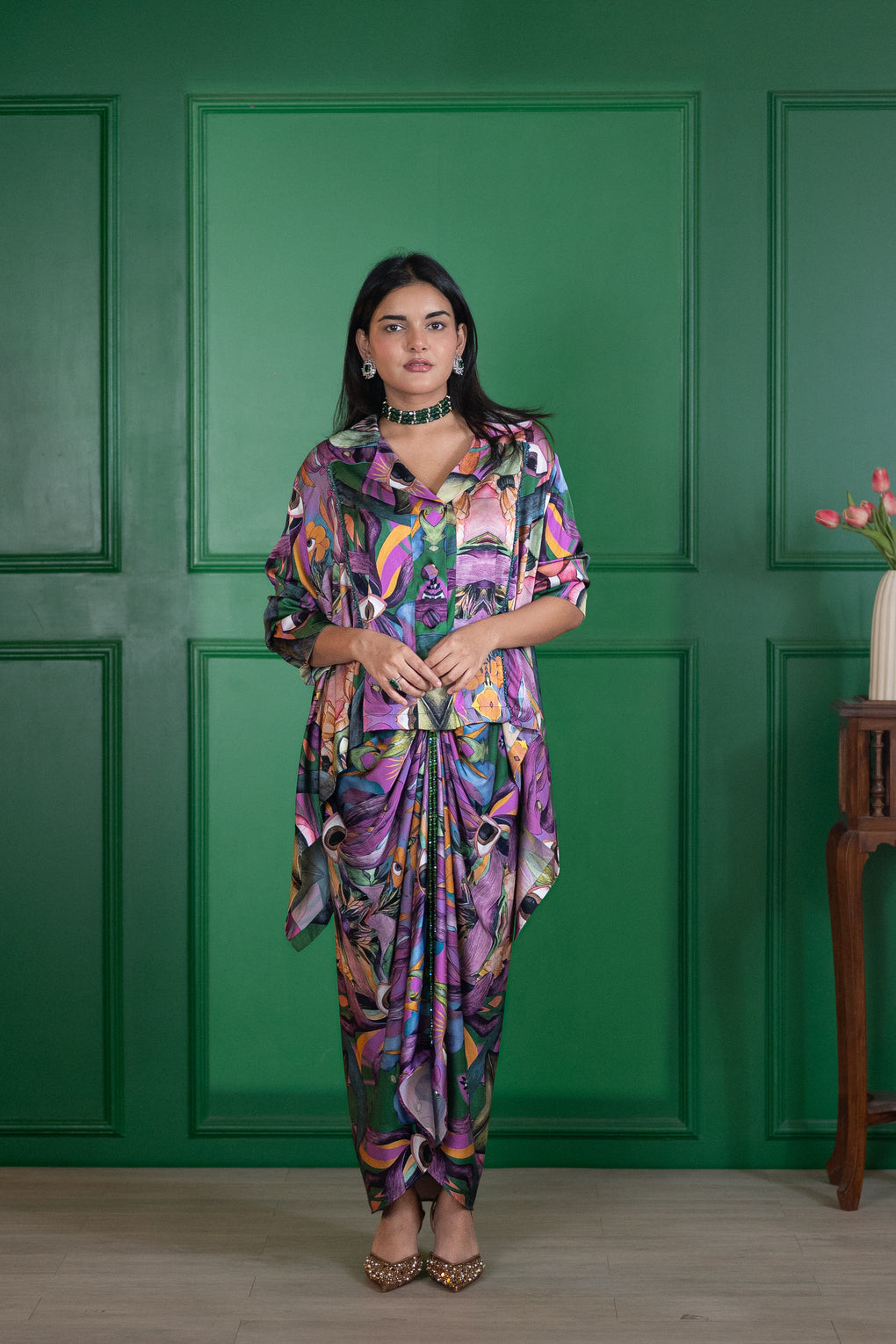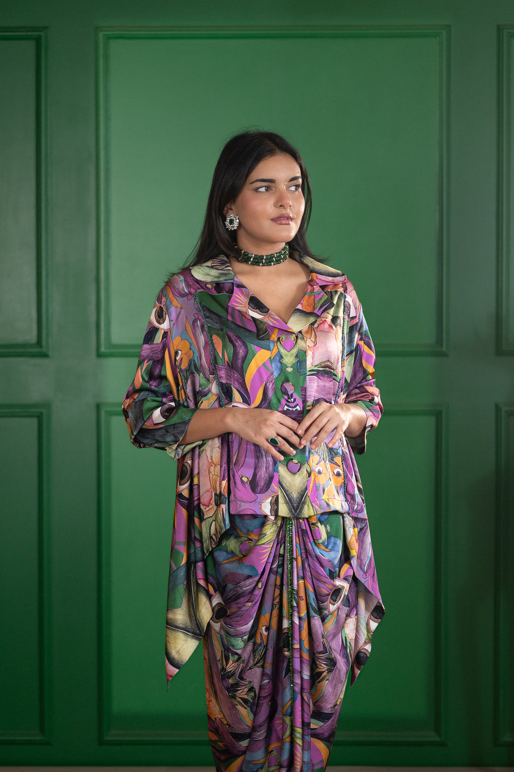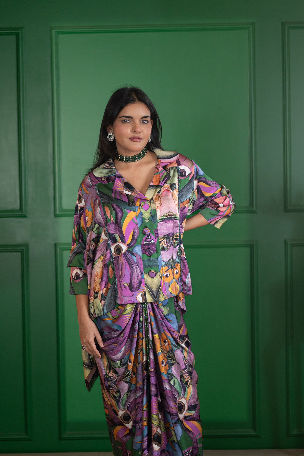 Crafted in a luxe satin blend, this statement shirt features a vivid abstract floral print in rich jewel tones. Designed in a relaxed silhouette with a structured collar, it is elevated with hand-applied green beadwork along the placket, adding subtle texture and refined shimmer.