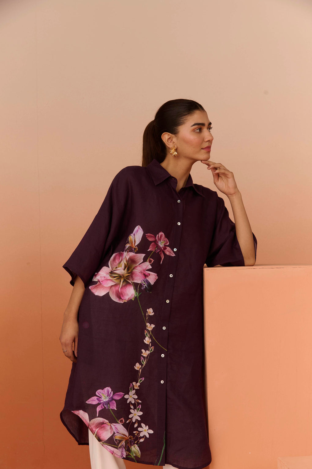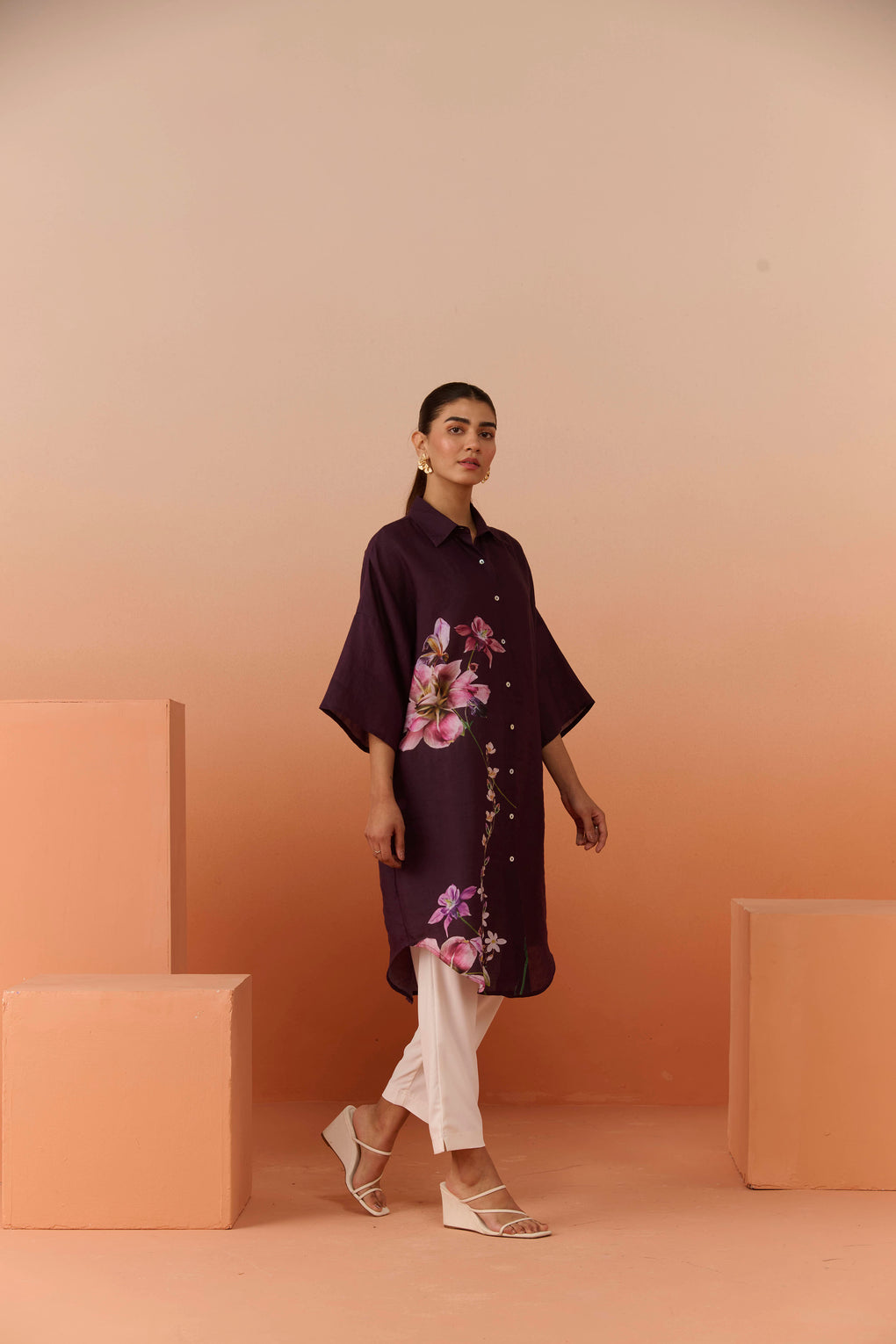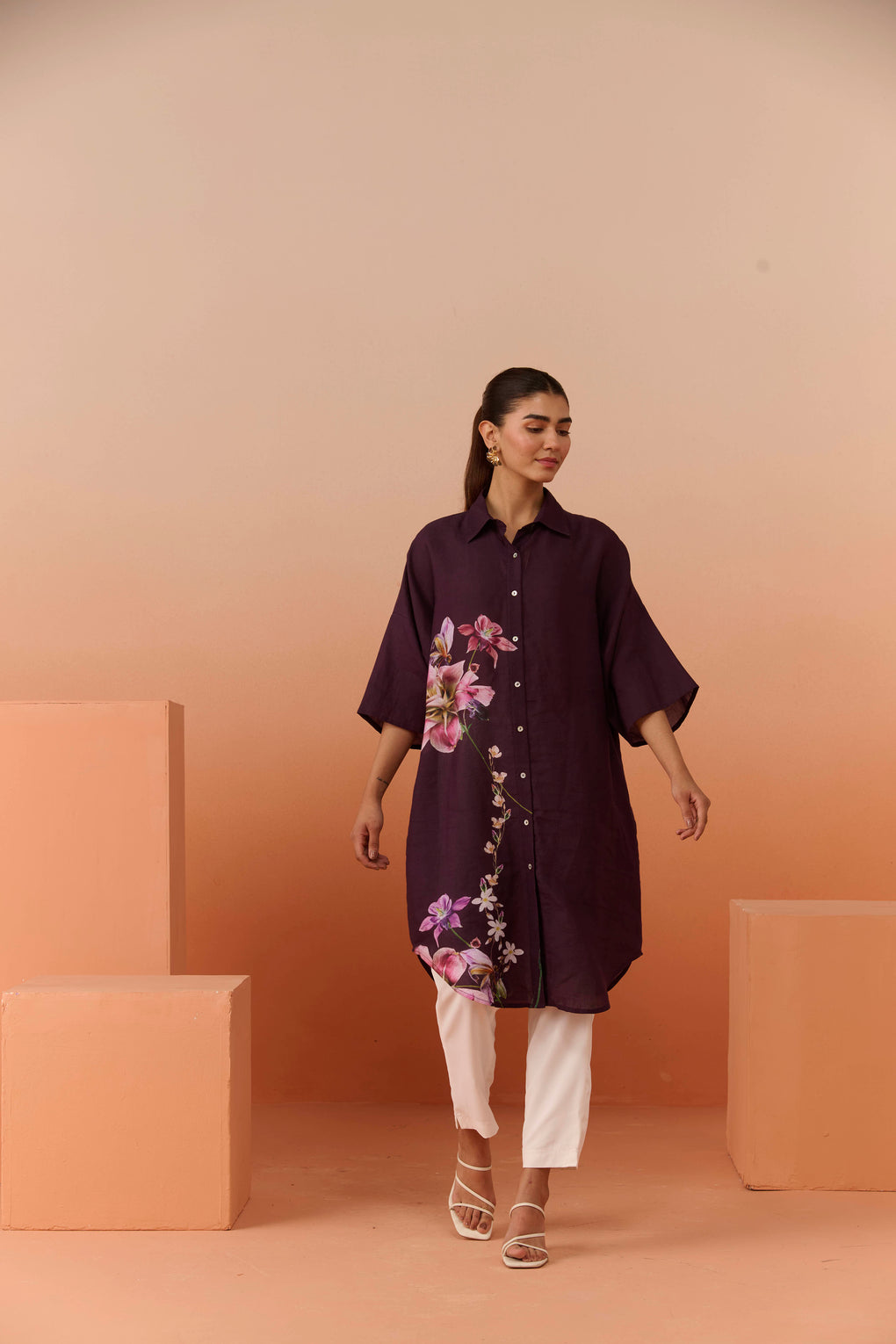 Crafted in premium breathable linen ,this elevated summer tunic features a fluid relaxed silhouette, refined collar detailing, and delicate placement florals that add understated femininity. Effortlessly luxurious and timeless, it’s designed for warm days with a polished edge.