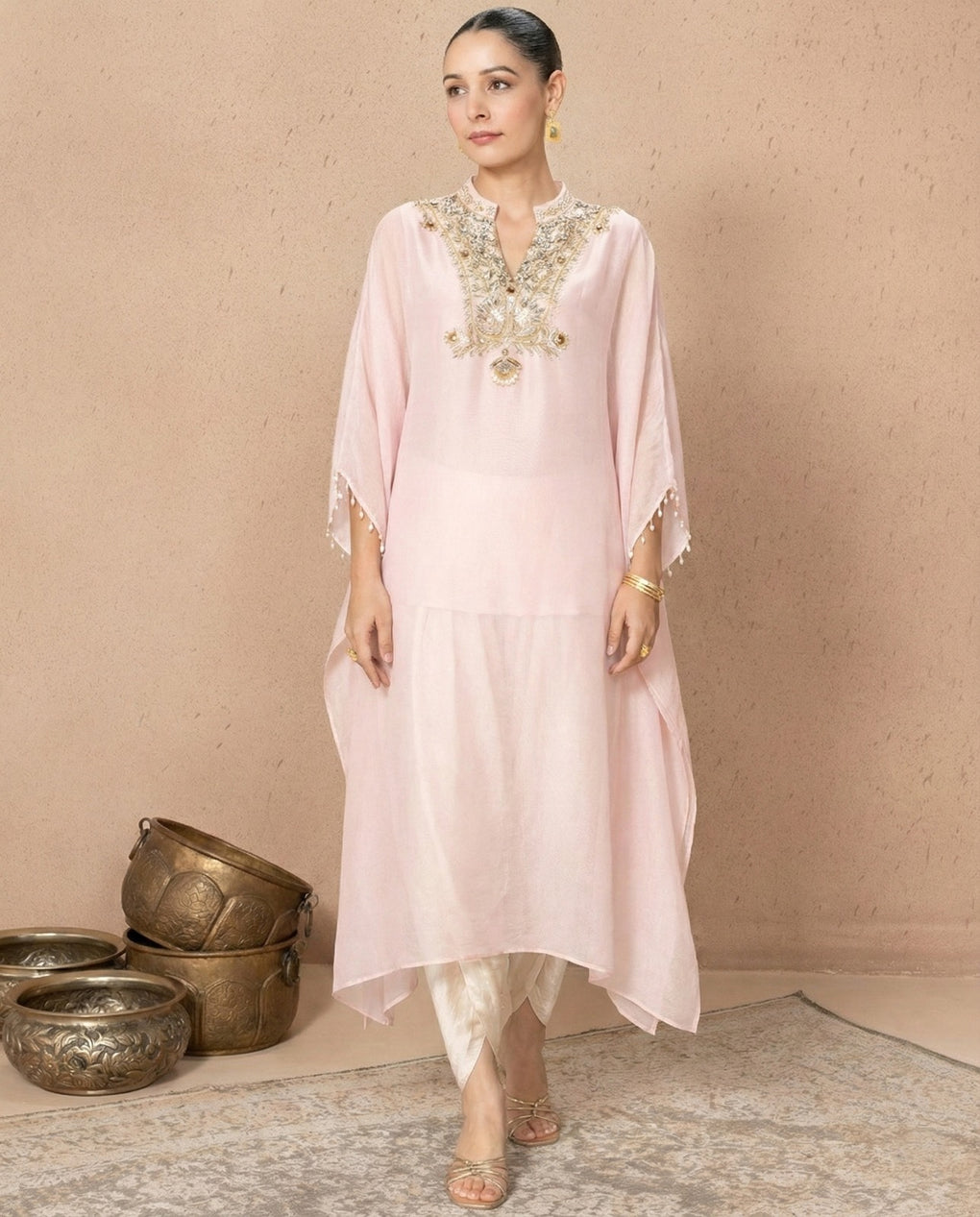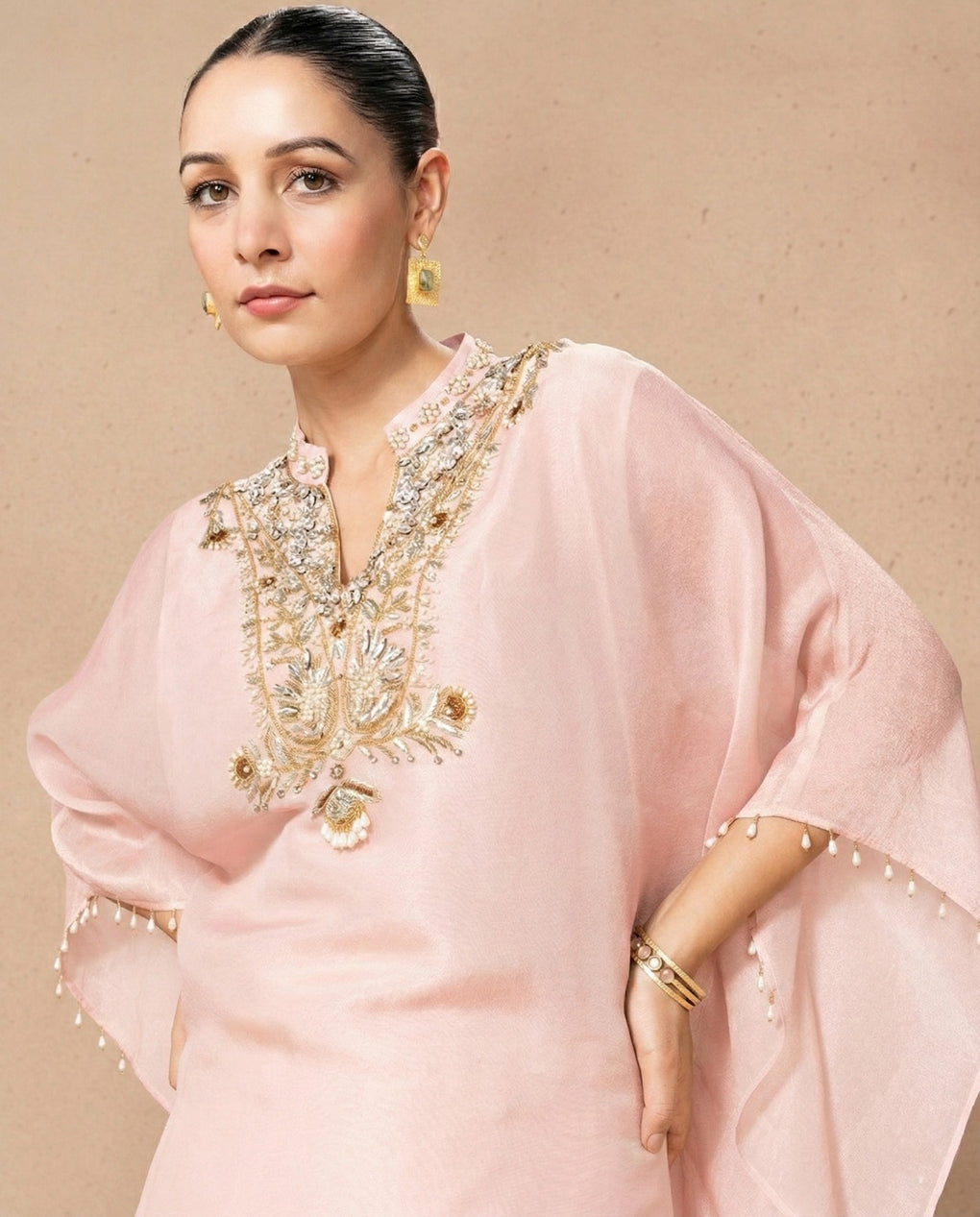 Unveil a world of ethereal beauty with this exquisite tissue kaftan dress, opulently adorned with intricate dabka, luminous pearls, and mesmerizing thread embroidery, all cascading into graceful hanging embellishments.