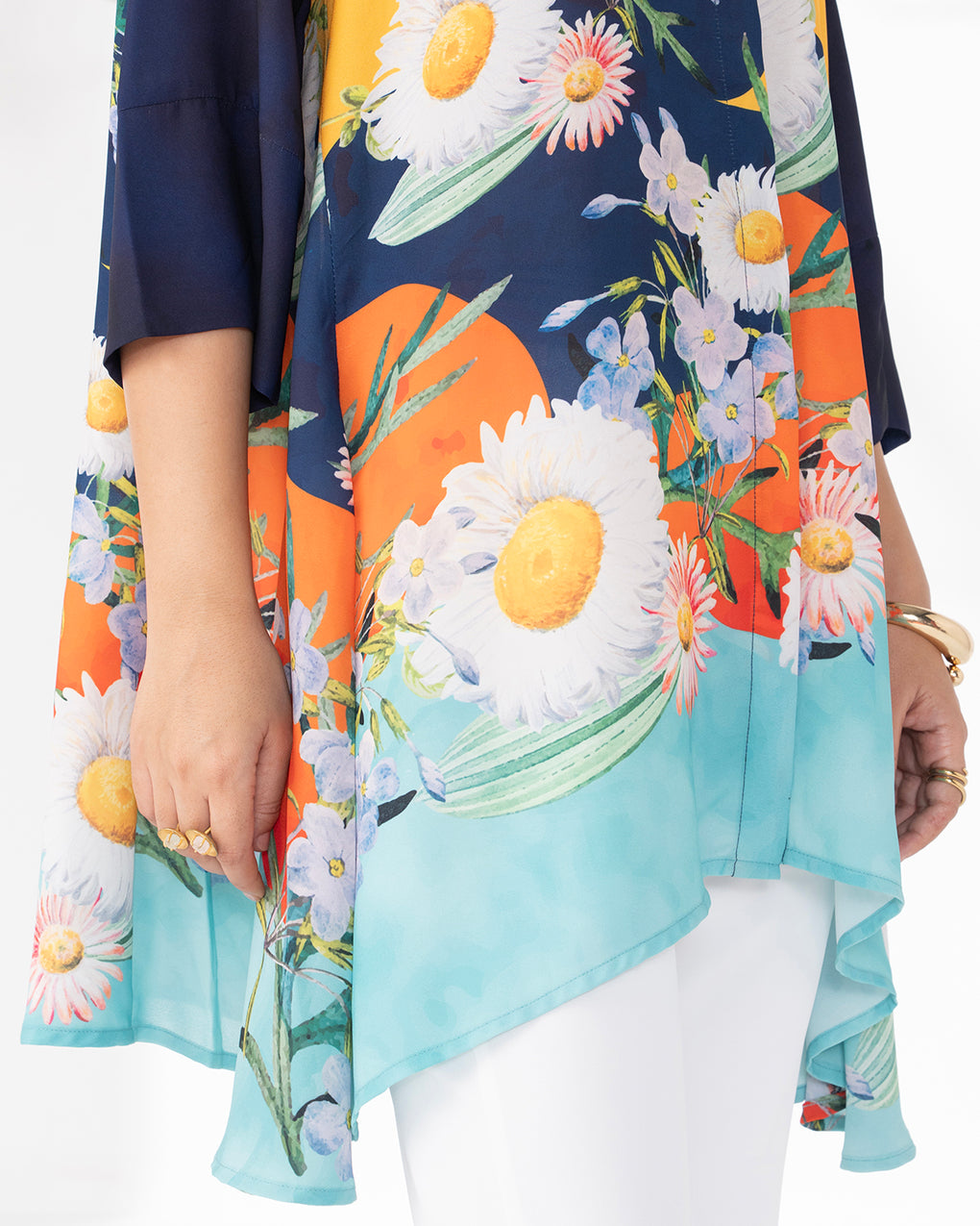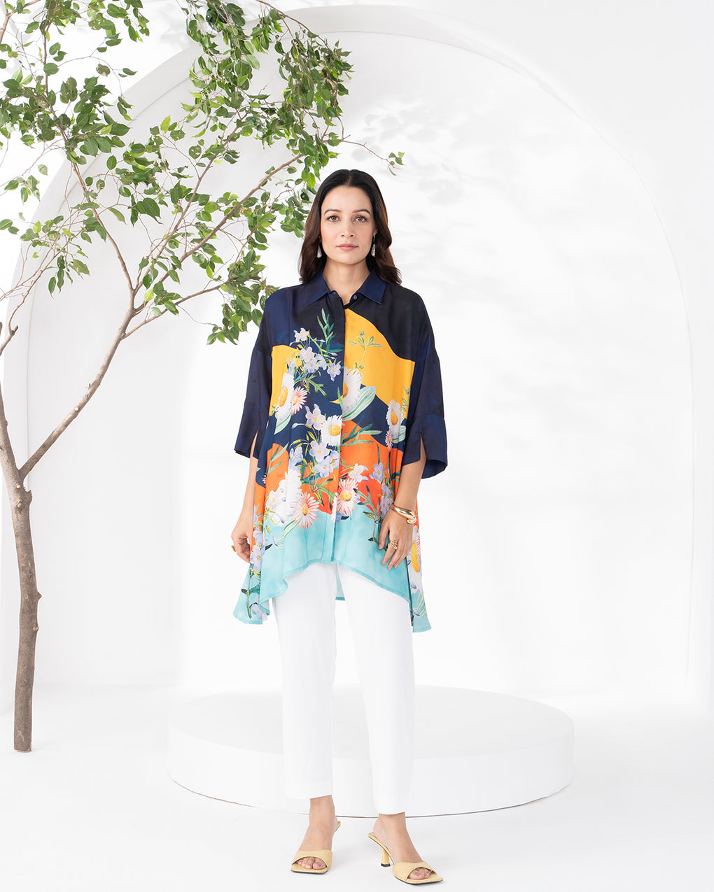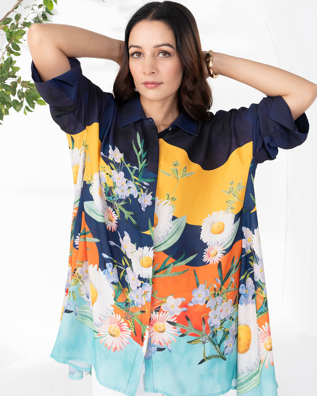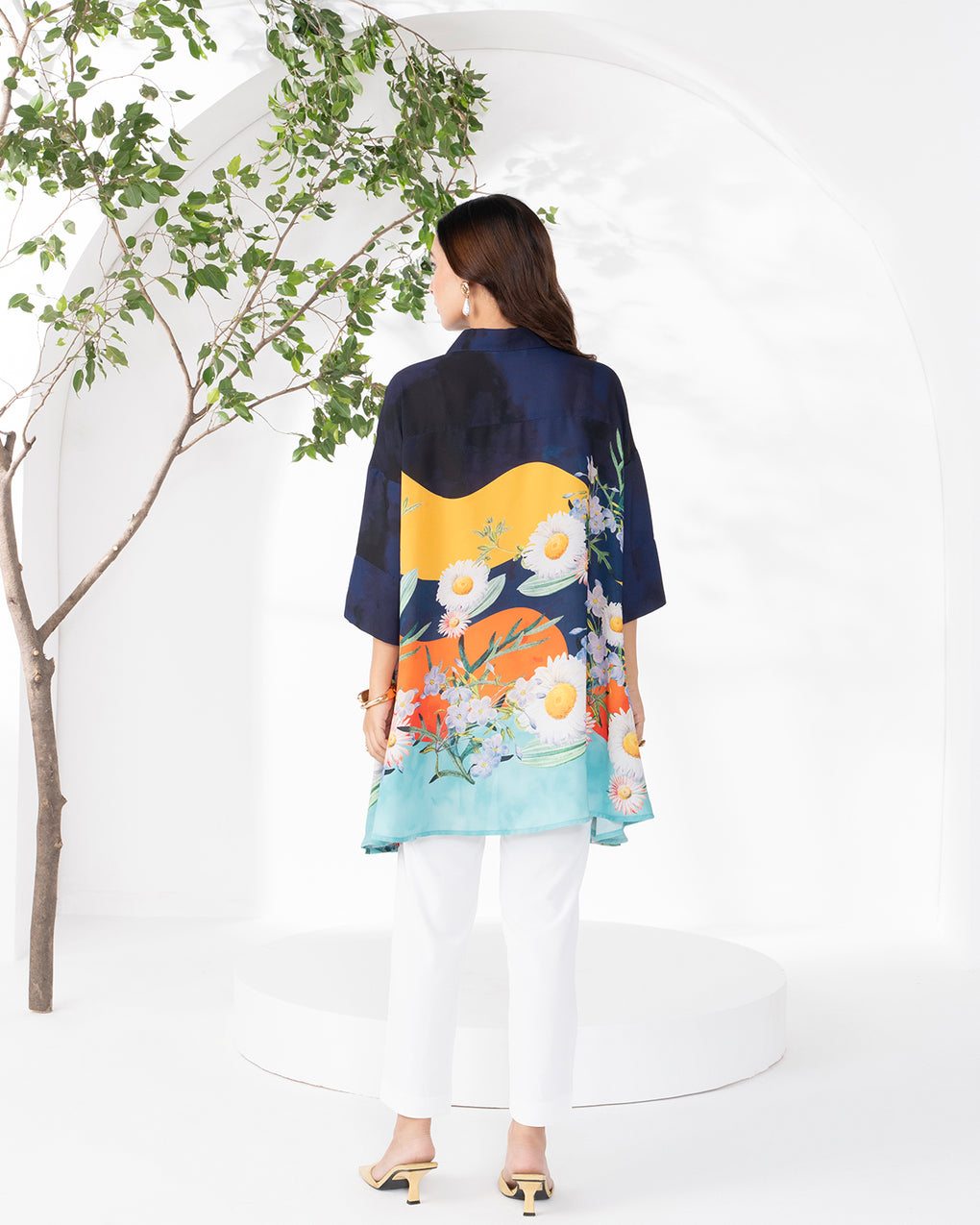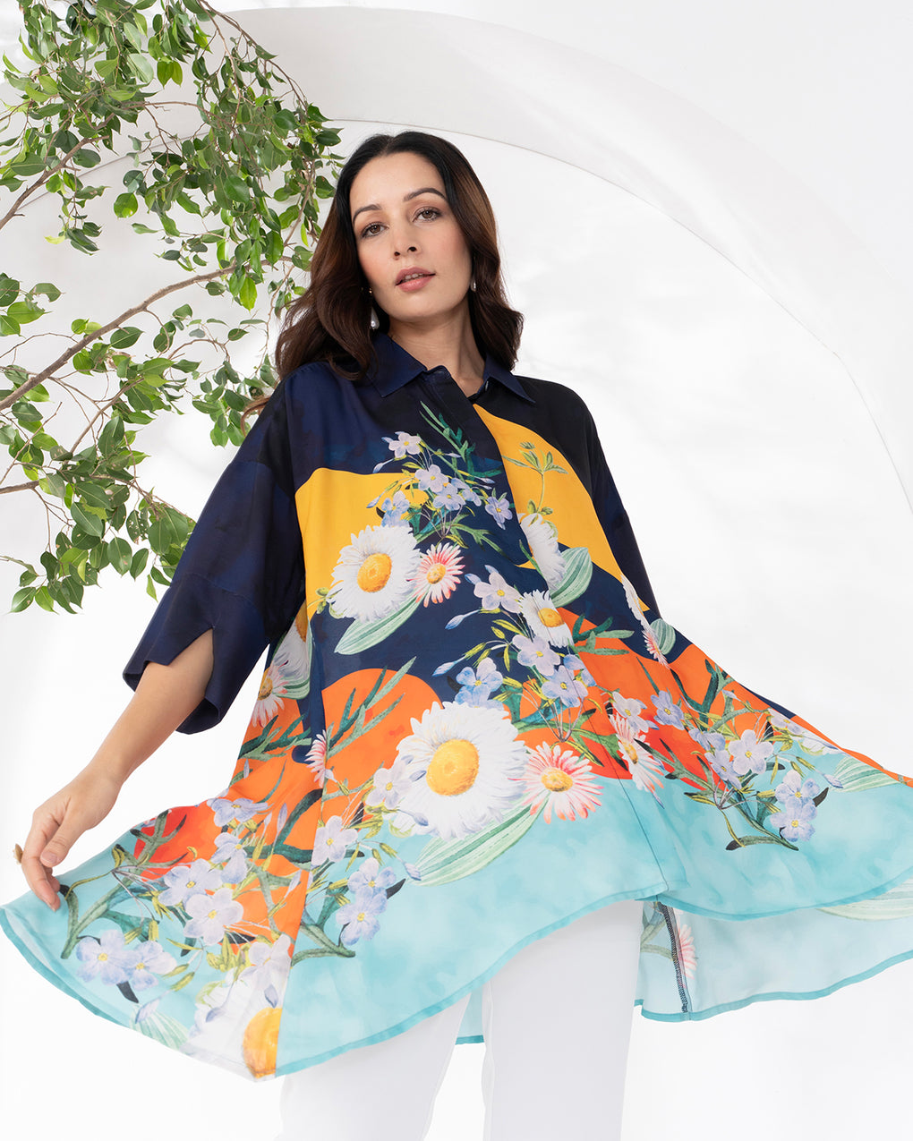 Bold and breezy, this long shirt features a statement floral print blended with striking color blocks for an effortlessly artistic vibe.