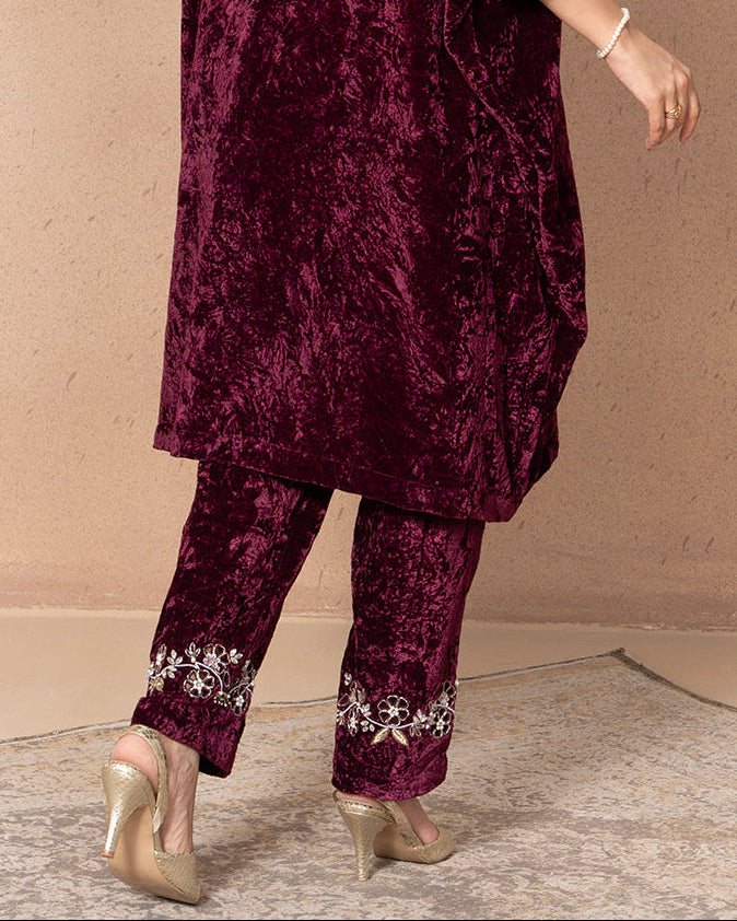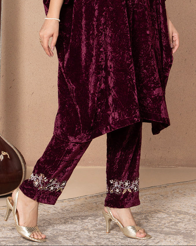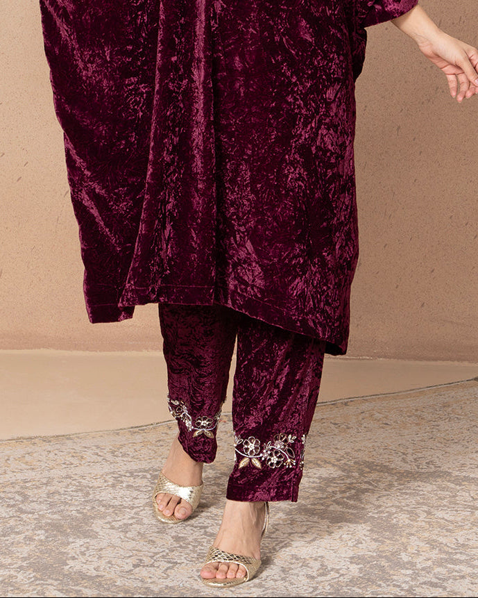 A pair of matching crushed burgundy velvet slim pants with delicate silver floral embroidery decorating the cuff or ankle area.