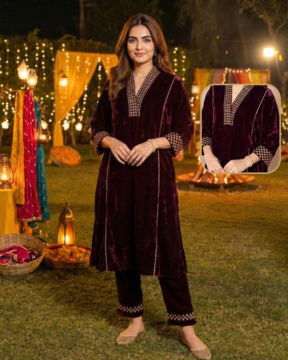Elegant velvet kurta with contrast checkered accents and subtle piping detail.