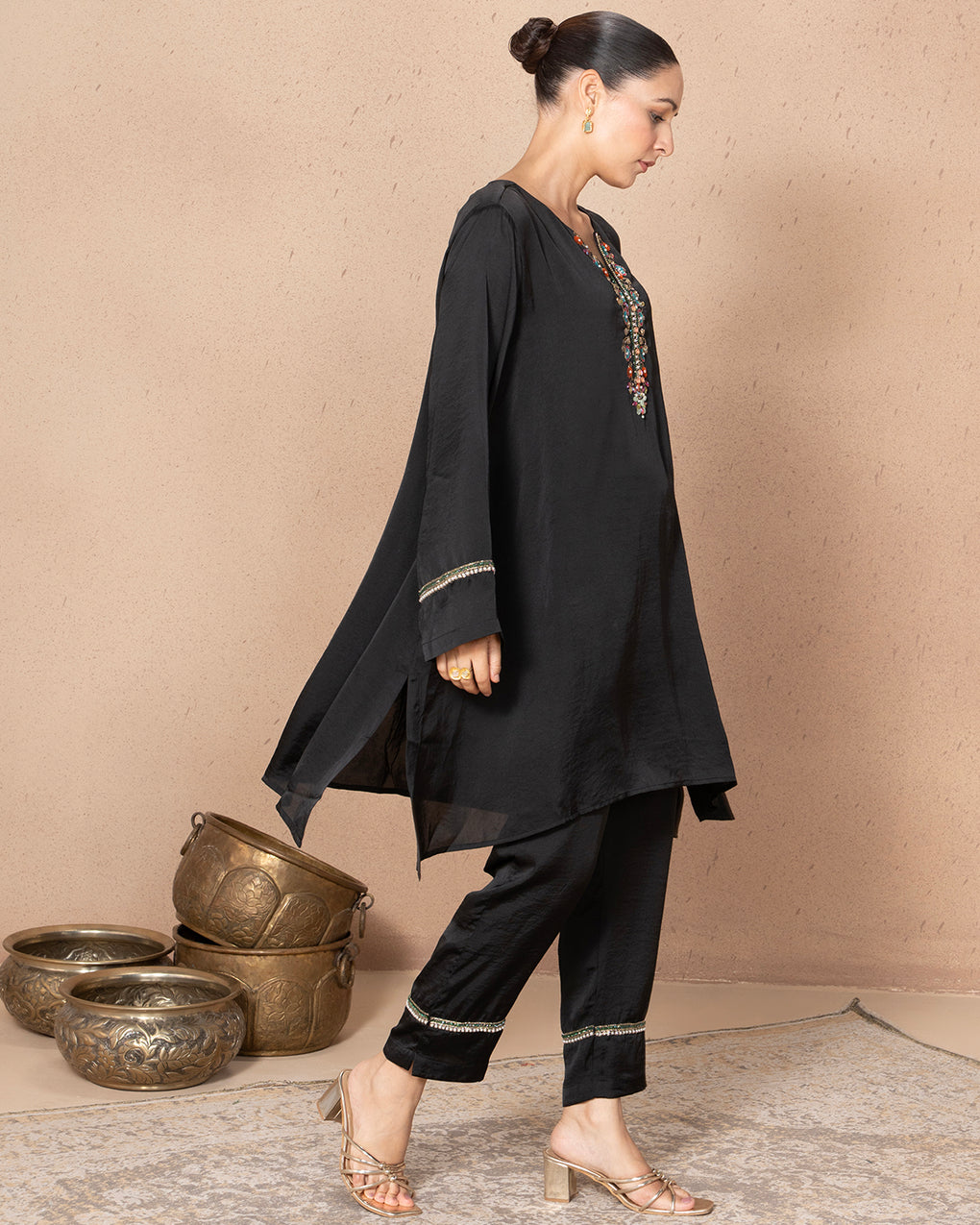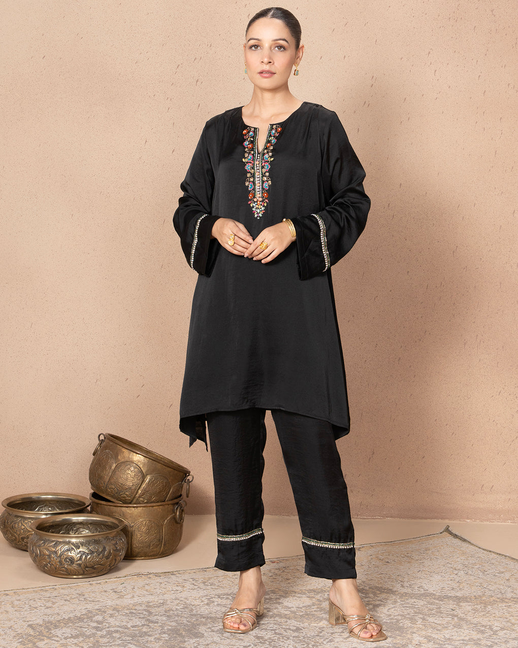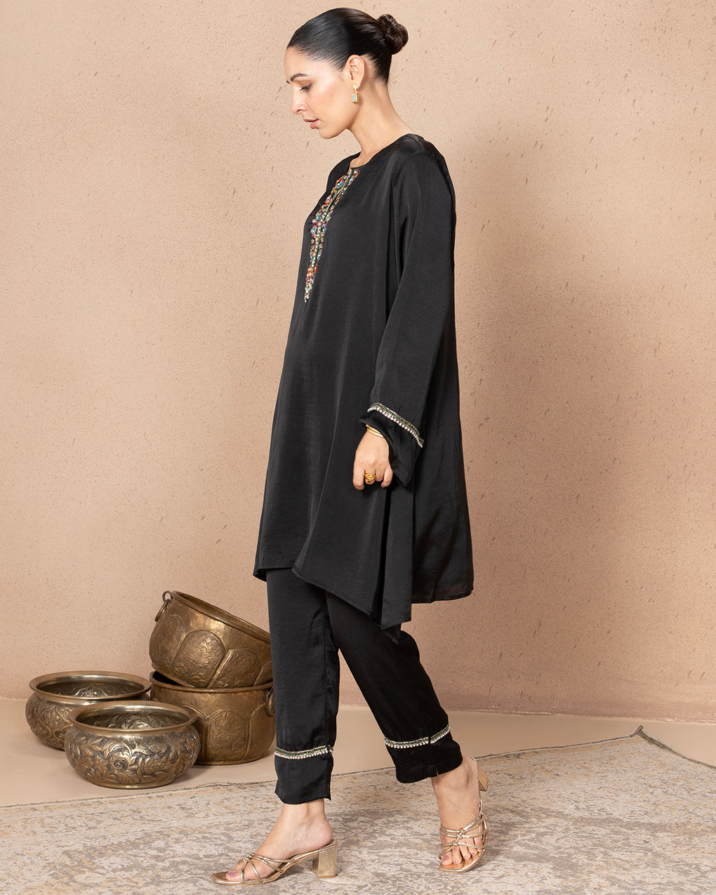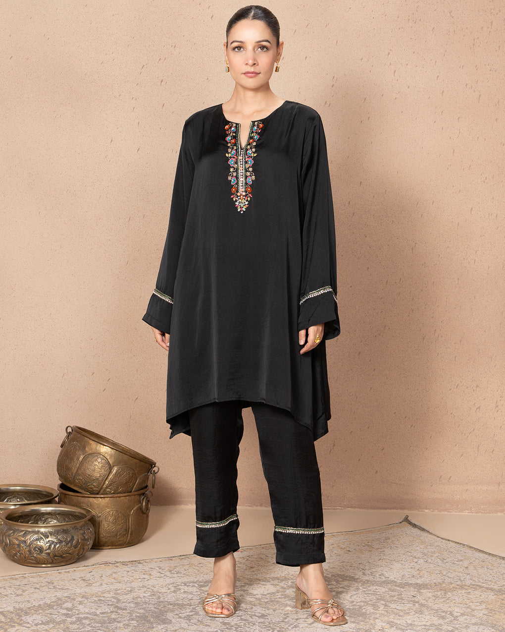 Discover a timeless ensemble crafted to make a statement. This intricately embroidered tunic exudes elegance with sleek lines and a structured fit, perfect for layering over as well. Made from satin fabric that embodies both glamour and comfort. Making it ideal for any occasion where style is essential