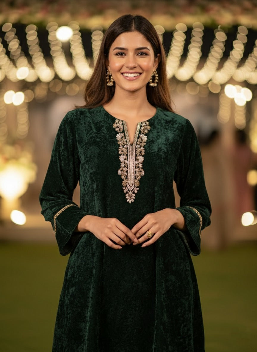 Discover a timeless ensemble crafted to make a statement. This intricately embroidered tunic exudes elegance with sleek lines and a structured fit, perfect for layering over as well. Made from premium velvet fabric that embodies both glamour and comfort,making it ideal for any occasion where style is essential.