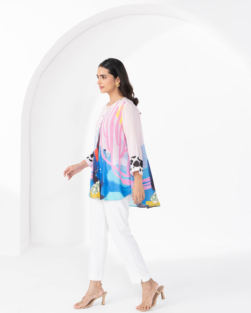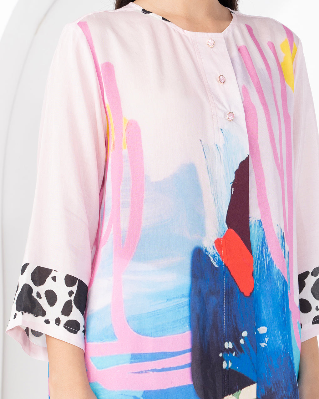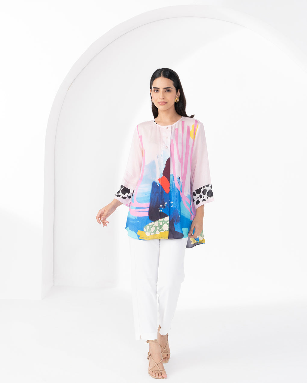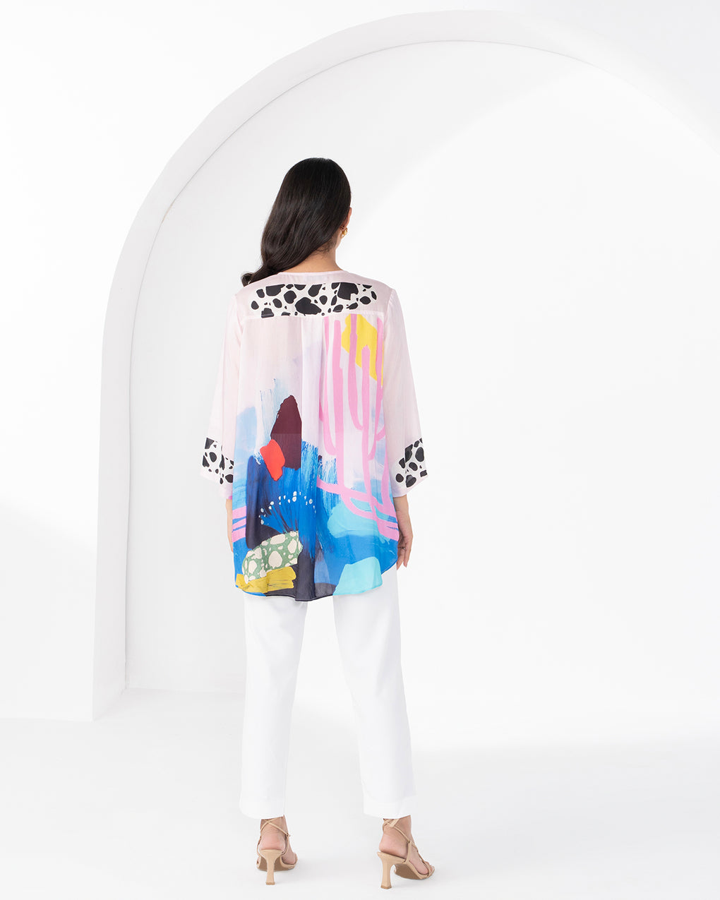 Bold and breezy, this long shirt features a statement floral print blended with striking color blocks for an effortlessly artistic vibe.