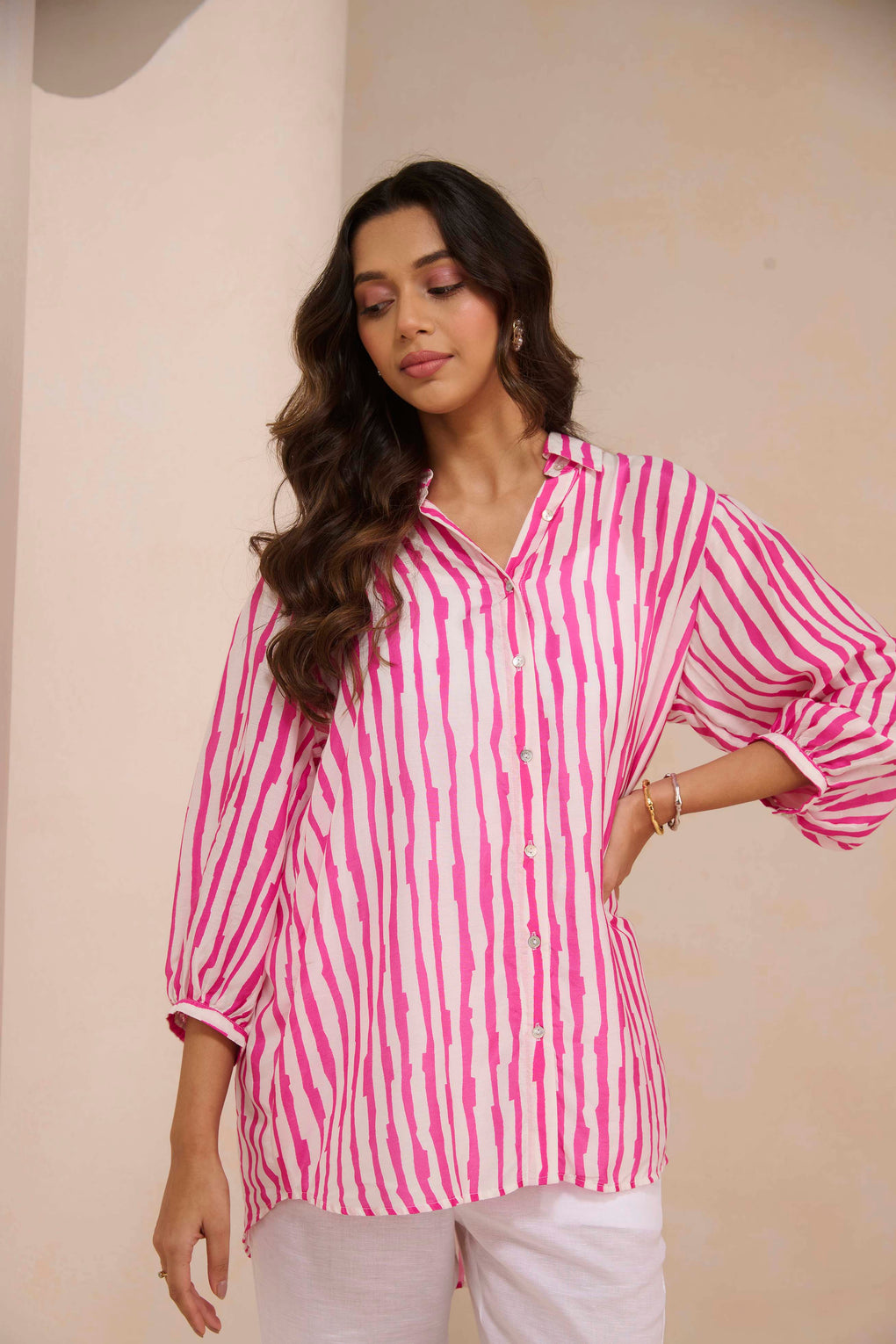 This is a fresh, vibrant summer shirt with a playful yet polished feel. The lightweight fabric and airy cut make it ideal for warm days. The bright  tones give it a cheerful, resort-ready vibe while the structured collar keeps it refined and versatile.